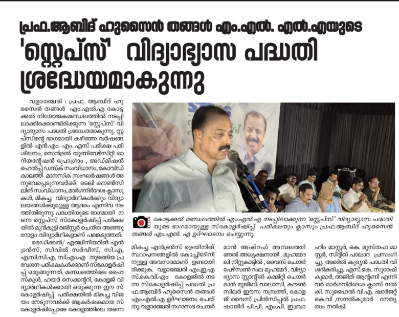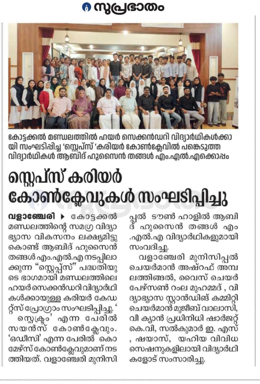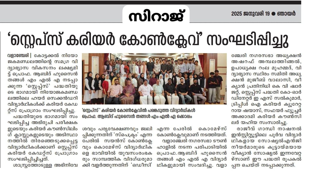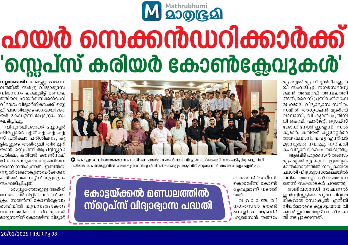 The STEPS Initiative, led by K. K. Abid Hussain Thangal MLA, is an educational program designed to help students in Kottakkal constituency explore and pursue successful career paths. Through aptitude assessments, career counseling, and industry interactions, STEPS equips students with the necessary skills and guidance to make informed academic and professional choices.