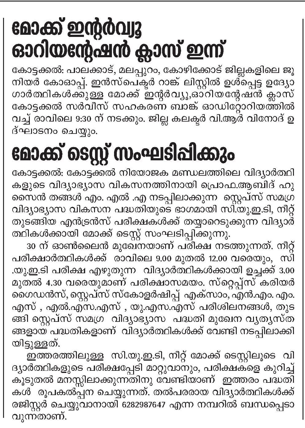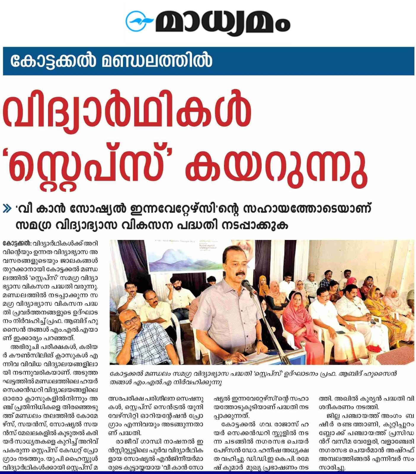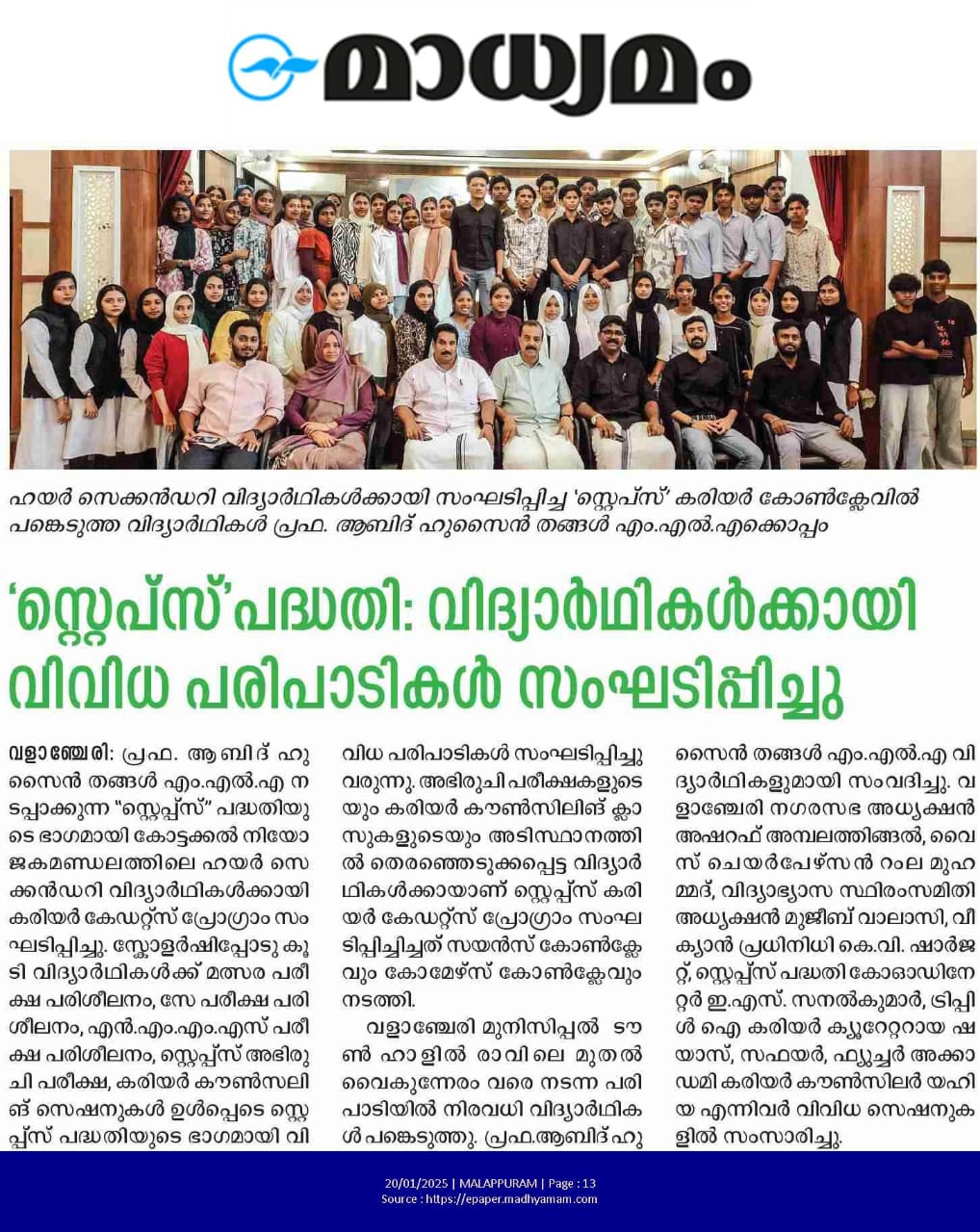 The STEPS Initiative, led by K. K. Abid Hussain Thangal MLA, is an educational program designed to help students in Kottakkal constituency explore and pursue successful career paths. Through aptitude assessments, career counseling, and industry interactions, STEPS equips students with the necessary skills and guidance to make informed academic and professional choices.