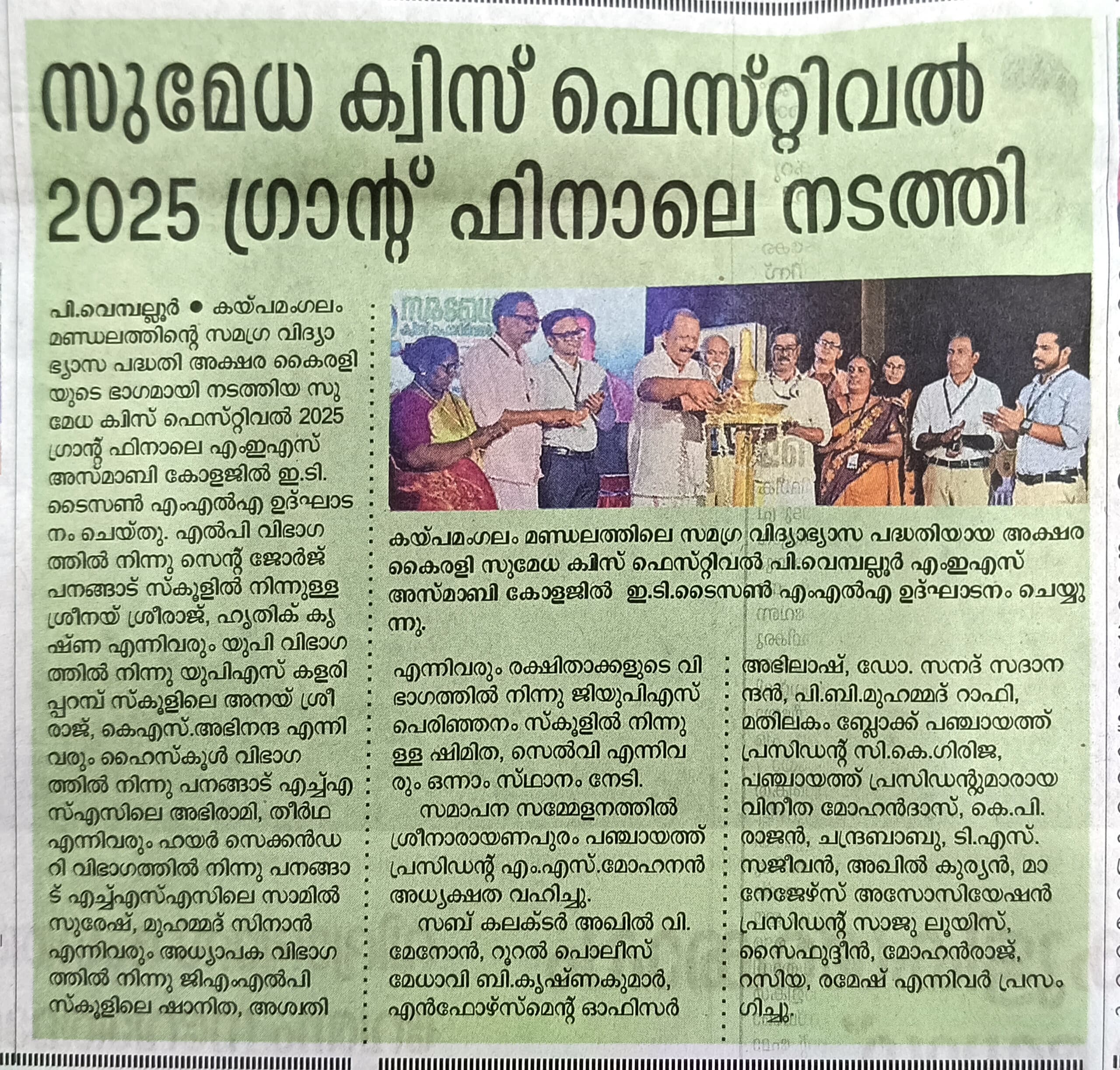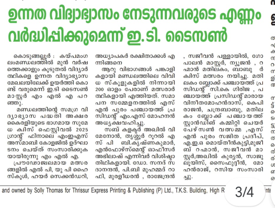 The Sumedha Project, launched by MLA E.T. Taison Master, is a visionary initiative aimed at empowering students in the Kaipamangalam Constituency. Focused on academic excellence and holistic development, Sumedha integrates competitive learning, skill-building, and career guidance to help students unlock their full potential. Key programs include the Sumedha Mega Quiz Competition, which enhances knowledge and analytical skills, specialized training for LSS and USS exams, and a Career Guidance Program, Cadets program etc.., that provides expert mentorship and career exploration opportunities.
